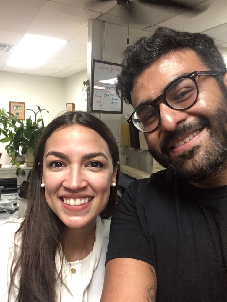 I sit and wait at a red light and, ever-so-irresponsibly, thumbed through my social media waiting for the green. I see that my friend Cynthia, a fellow activist, posted on Facebook that she was eating at The Good Luck Café and Alejandra Ocasio Cortez happened to be sitting a few tables away. ¿Pero como? The light is still red, so I re-read the post to make sure I understood correctly. I stop the turn signal and take a little detour to the café since it’s only a few streets away. I wouldn’t have even considered meeting any other politician since I’m fairly disgusted with US politics at the local and national level. This is different. I cruise by, peek into the window and see a woman wearing a white business suit taking pictures with customers. Sure enough, it’s her! I park, casually walk in, wait my turn and try to hide the fact that I was literally freaking the f**k out.