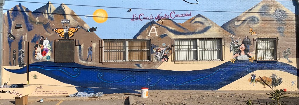 La Casa de Nuestra Comunidad, located in Anthony, NM was started during Christmas week 2020 and finished in January 2021. La Casa, a domestic violence shelter and non-profit agreed to share their wall with us. With feedback from the youth, EC, and La Casa, we came up with a piece of art that pays tribute to cultura colonia, iconic heroes and the beautiful landscape that surrounds the borderlands. This mural plays tribute to Southern New Mexico and El Paso, TX.
