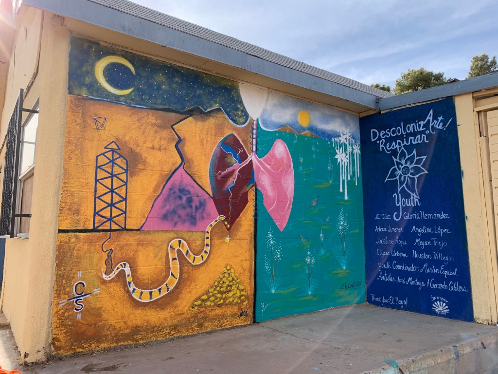 “Respirar” was intentional and it’s located in Chaparral, NM. Youth participants learned about the proposed fracking plant, Newman 6, that will have long-standing damage to the residents of Northeast El Paso and the neighboring community of Chaparral, NM. Artist Gerardo Caldera created some very touching pieces dedicated to the victims of COVID using lungs. I loved the idea, so we invited him to help create. The desolate desert is home to the slithering corporations that seek profits over people. The right side is of greener pastures, renewable energy and air.